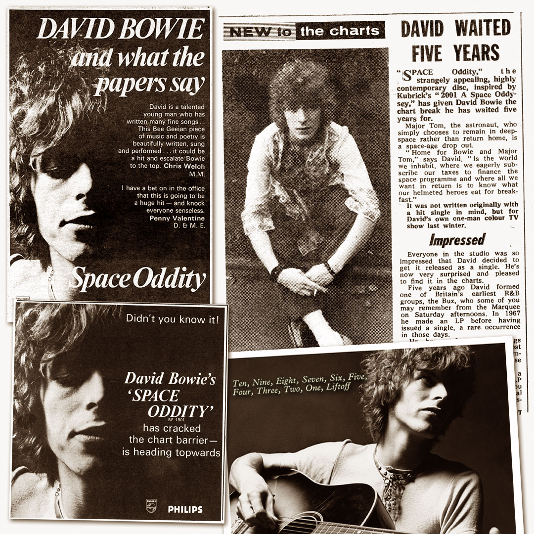 "SPACE Oddity," the strangely appealing, highly contemporary disc, inspired by Kubrick's "2001 A Space Oddysey," has given David Bowie the chart break he has waited five years for. Major Tom, the astronaut, who simply chooses to remain in deep-space rather than return home, is a space-age drop out. "Home for Bowie and Major Tom," says David, "is the world we inhabit, where we eagerly sub-scribe our taxes to finance the space programme and where all we want in return is to know what our helmeted heroes eat for breakfast."