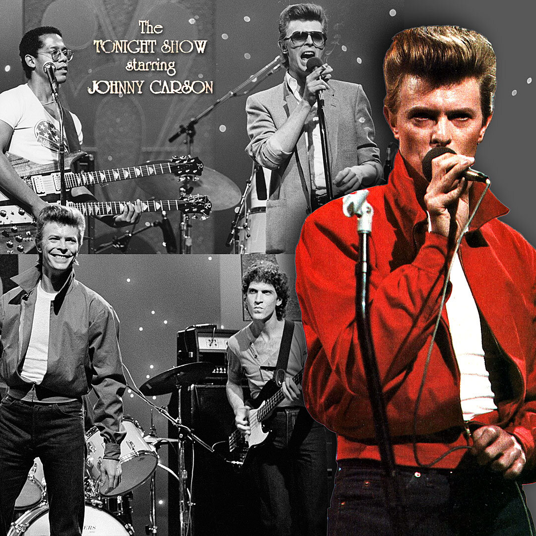 Our montage shows images from the performance on The Tonight Show and the top mono shot is from the soundcheck. Bowie looked magnificent in an obvious tribute to James Dean in Rebel Without A Cause.