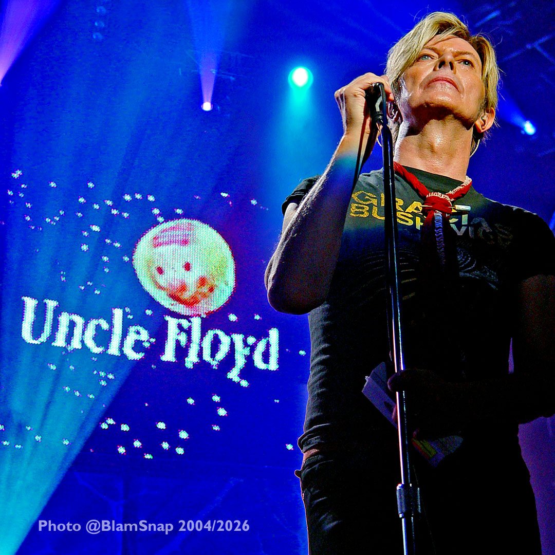 David was a big fan of The Uncle Floyd Show to the point of using around one minute and twenty seconds of dialogue from it for the TOY track, Uncle Floyd. That version never saw the light of day officially, but it did morph into Slip Away when it was reimagined for Heathen in 2002.