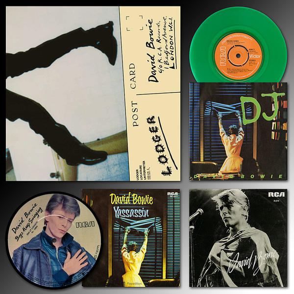 Pictured in our montage clockwise from top left: UK Lodger front cover, UK limited edition D.J. green vinyl single, Yassassin Turkish picture sleeve, Yassassin Netherlands picture sleeve, Boys Keep Swinging, Spanish promo picture disc.