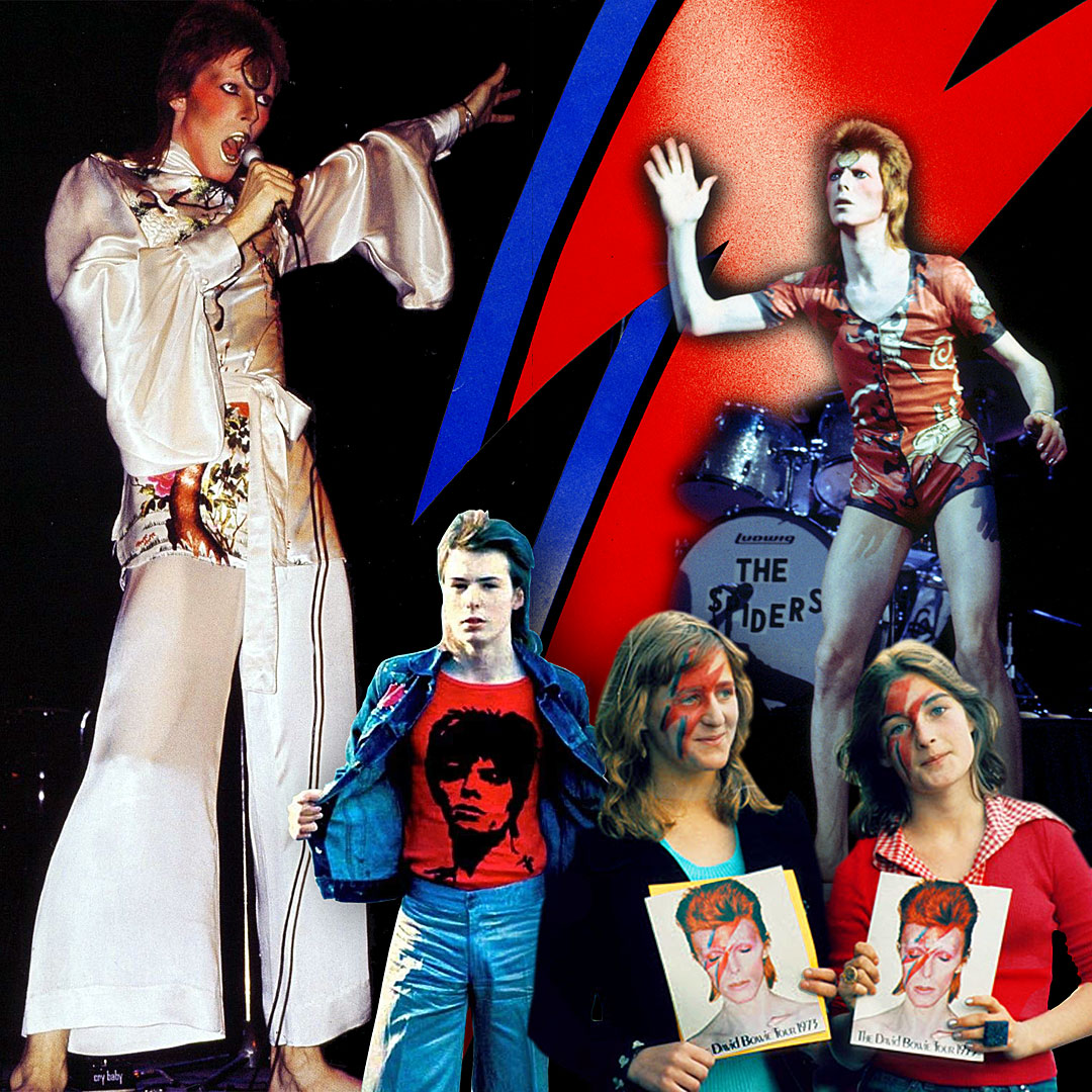 Our montage shows Bowie in performance on the night (main image by Mick Rock) and fans outside Earl’s Court before the show.