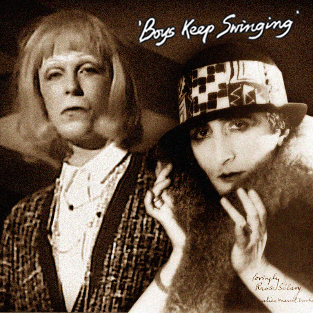 FOOTNOTE: Pictured here are David Bowie as unspecified female (but possibly a nod to his co-star Marlene Dietrich in Just A Gigolo), in the 1979 promo video for Boys Keep Swinging. And on the right is aforementioned Rrose Selavy (Marcel Duchamp), pictured by Man Ray in 1920. © Man Ray Trust/ADAGP.