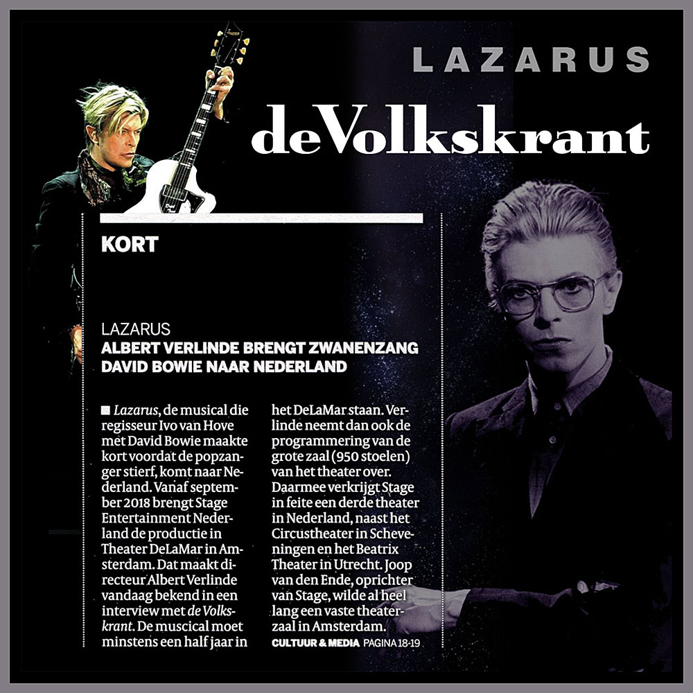 So, to recap: Ivo van Hove-directed Dutch language version of Lazarus (with songs in the original English), to run at the DeLaMar Theater in Amsterdam for at least six months from September, 2018. More details as we get them.