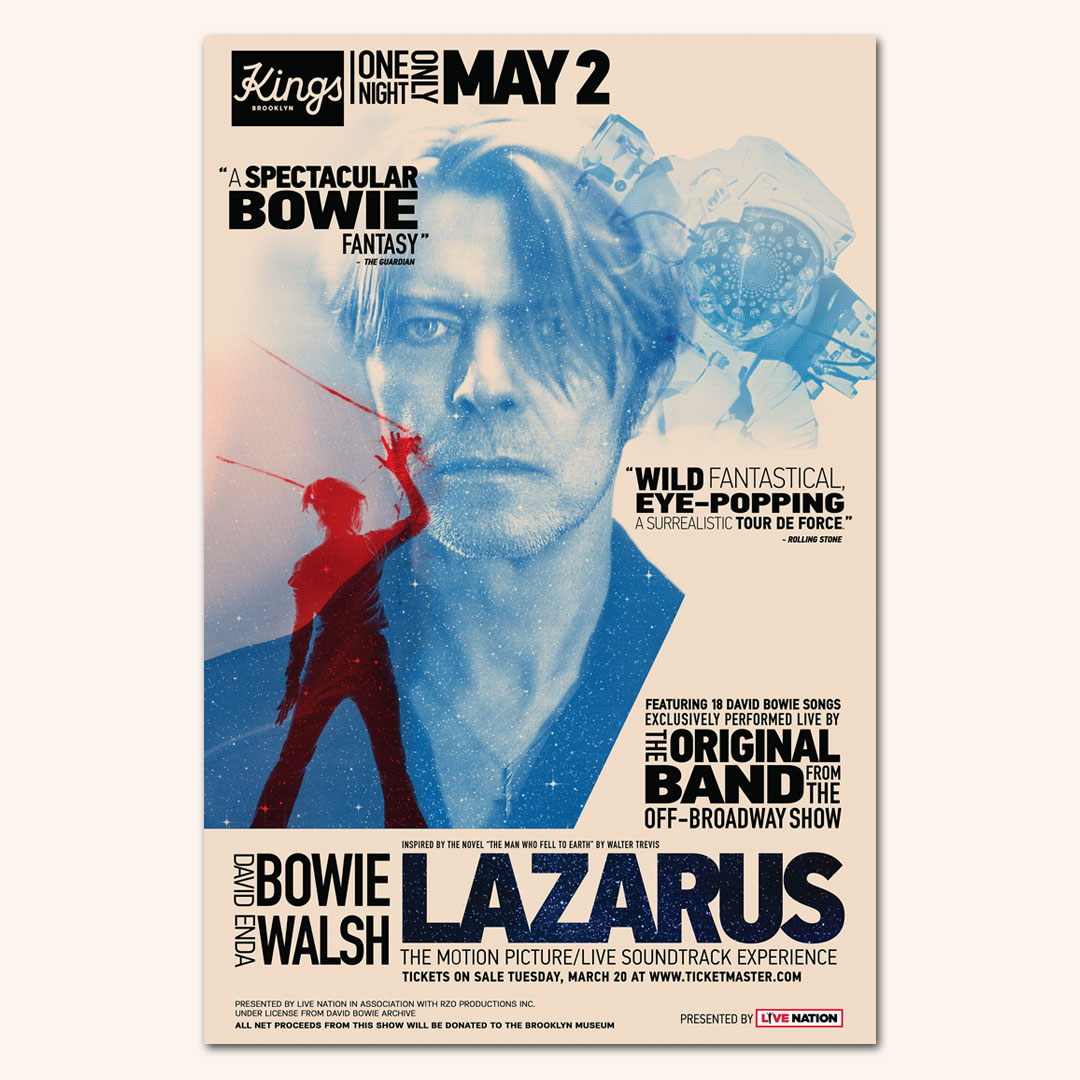 Lazarus The Motion Picture/Live Soundtrack Experience is presented by Live Nation in association with RZO Productions, Inc., under license from David Bowie Archive. All net proceeds from this show will be donated to Public Programs at the Brooklyn Museum including monthly, talks, performances, and screenings.